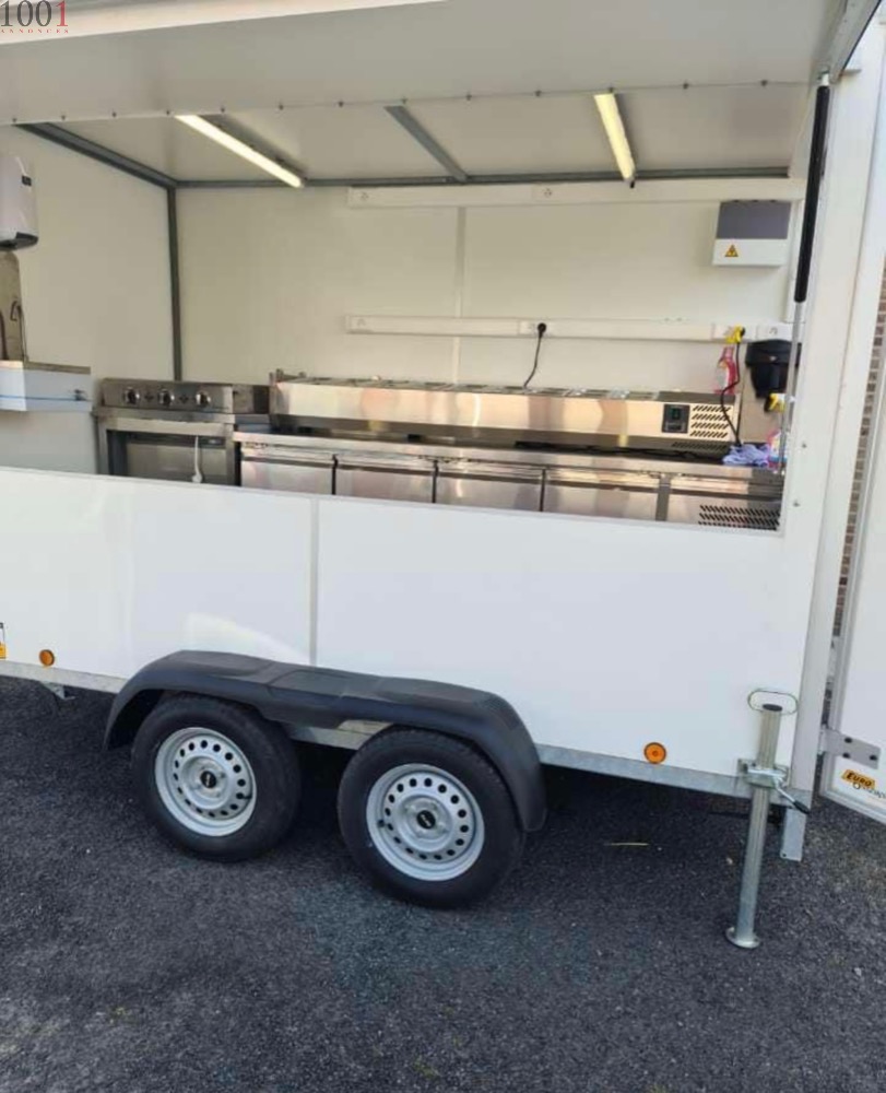 Food truck à vendre 10000€ avec grand frigo (4 portes), saladette 8 bacs, congélateur, cafetière, friteuse, plancha, four/micro-onde, évier, dérouleur à papier et armoire de rangement. Tous est en inox (sauf le dérouleur à papier).