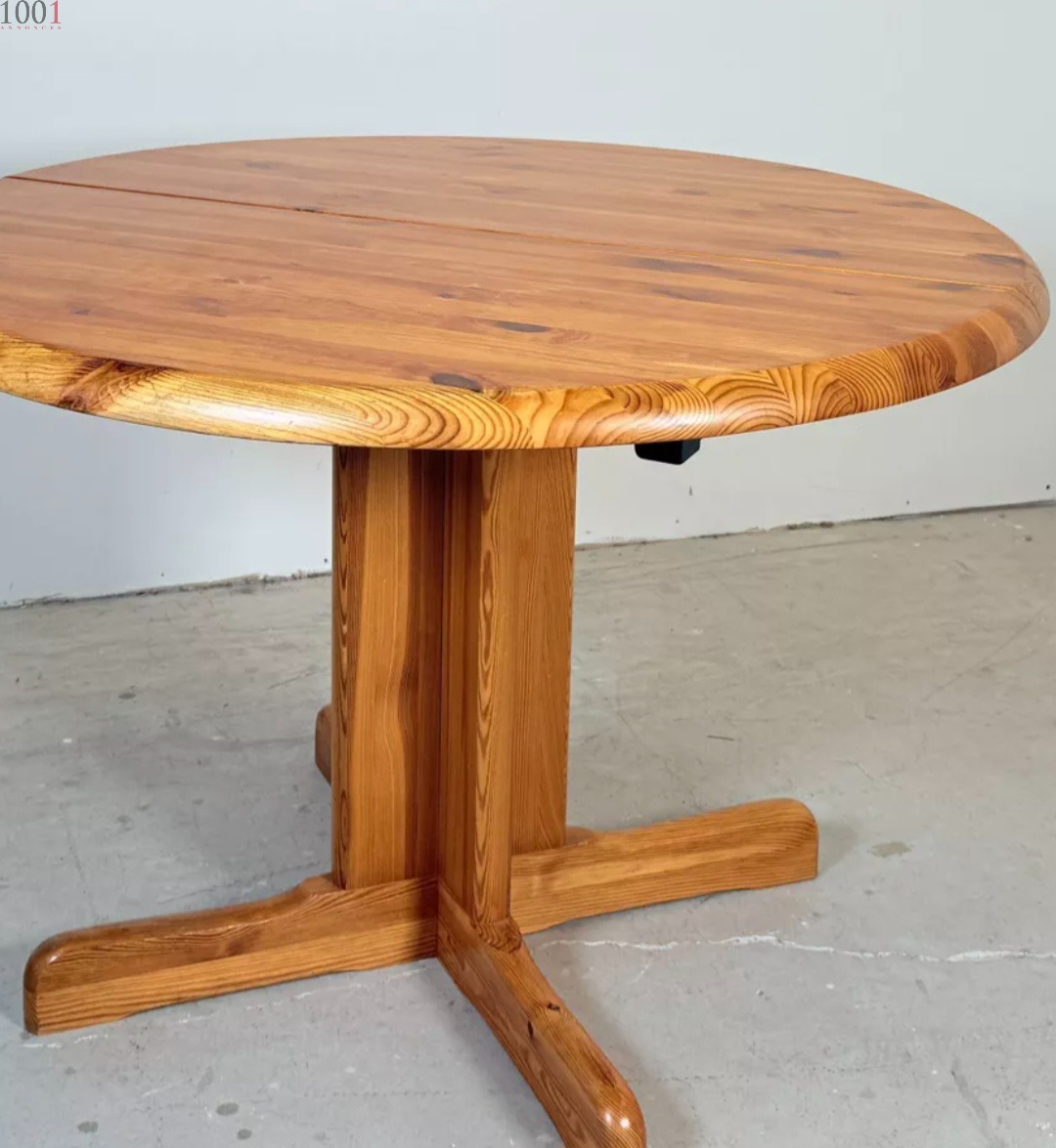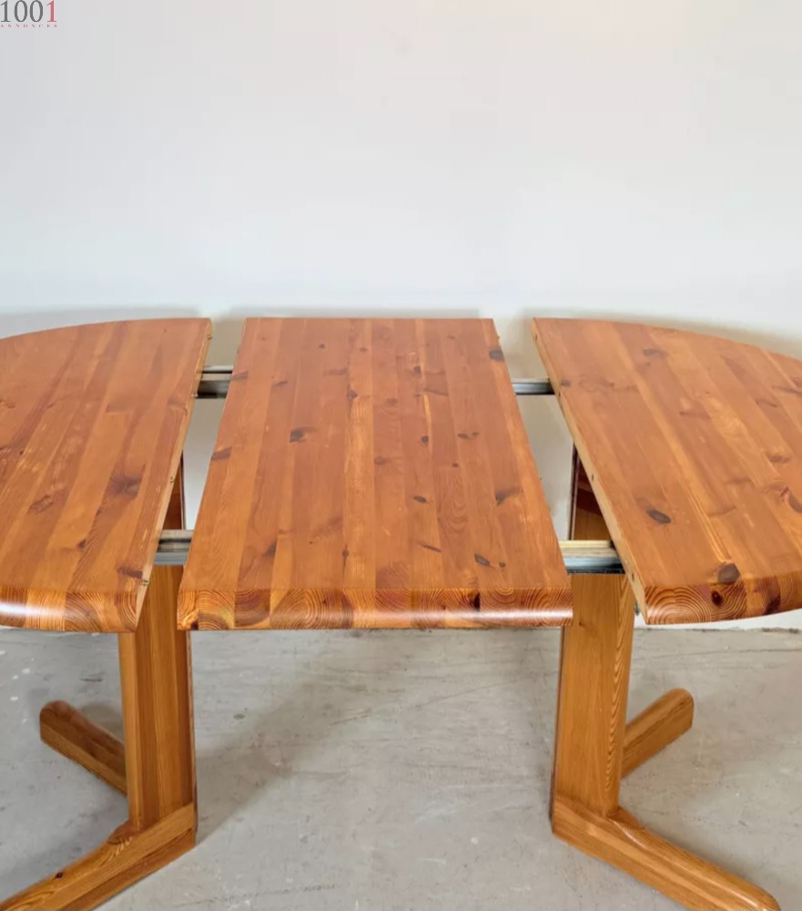 Table de salle à manger extensible en pin massif. Probablement fabriquée par la société danoise Korup, d'après un design de Rainer Daumiller. Dans sa version réduite, le plateau de 4 cm d'épaisseur a un diamètre de 106 cm, extensible de 45 cm à 151 cm. Le plateau a été poncé et recouvert d'un vernis semi-brillant. Cette table est en bon état vintage.