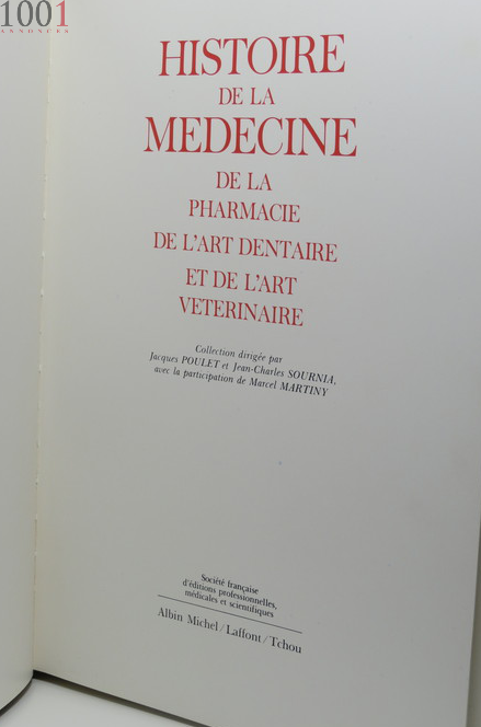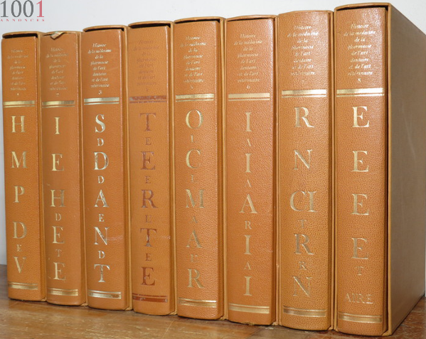 Idéal pour la déco du cabinet médical, Albin Michel & Laffont, Auteurs : Jacques Poulet, Jean-Charles Sournia et Marcel Martiny, Éditeur : Société Française D'éditions Professionnelles, Médicales Et Scientifiques, en simili cuir, grands formats : 21 x 30 cm, sous coffrets toilés, médailles en bronze différentes sur les plats (Hippocrate, Galien, Vésale, Harvey, Laennec, Claude Bernard, Fleming, Marie Curie). Les volumes mis côte à côte reproduisent le titre en doré, reliures créées par Pierre Faucheux, iconographie abondante et de qualité, bibliographies sur les spécialités médicales, environ 350-400 pages par volume, complet en 8 volumes.