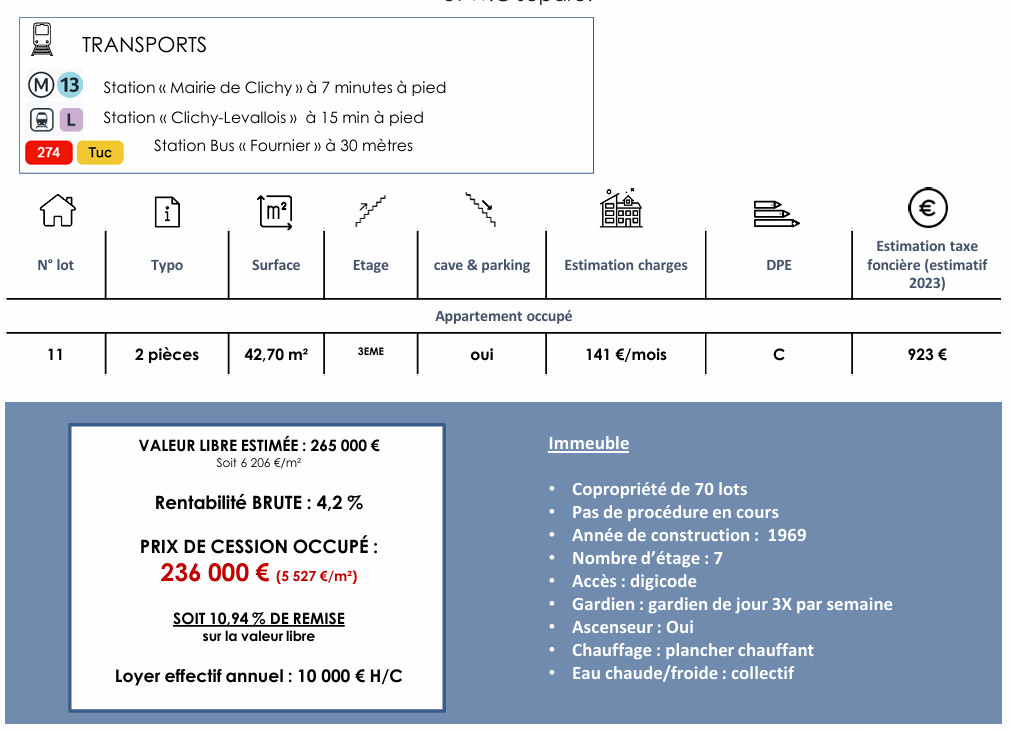 EXCLUSIVITE – Clichy – Appartement 2 pièces occupé idéal investisseur