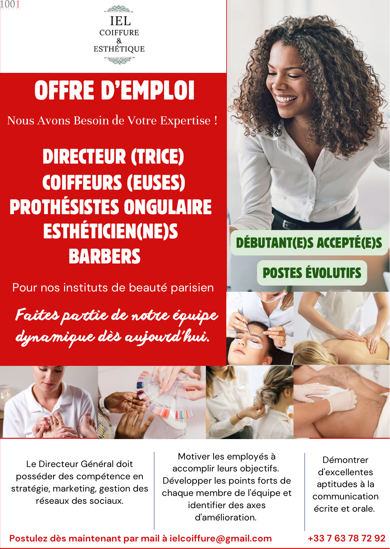 IEL COIFFURE & ESTHÉTIQUE PARIS recrute COIFFEURS / COIFFEUSES, Esthéticiennes polyvalentes, prothésistes ongulaire, Directeurs.