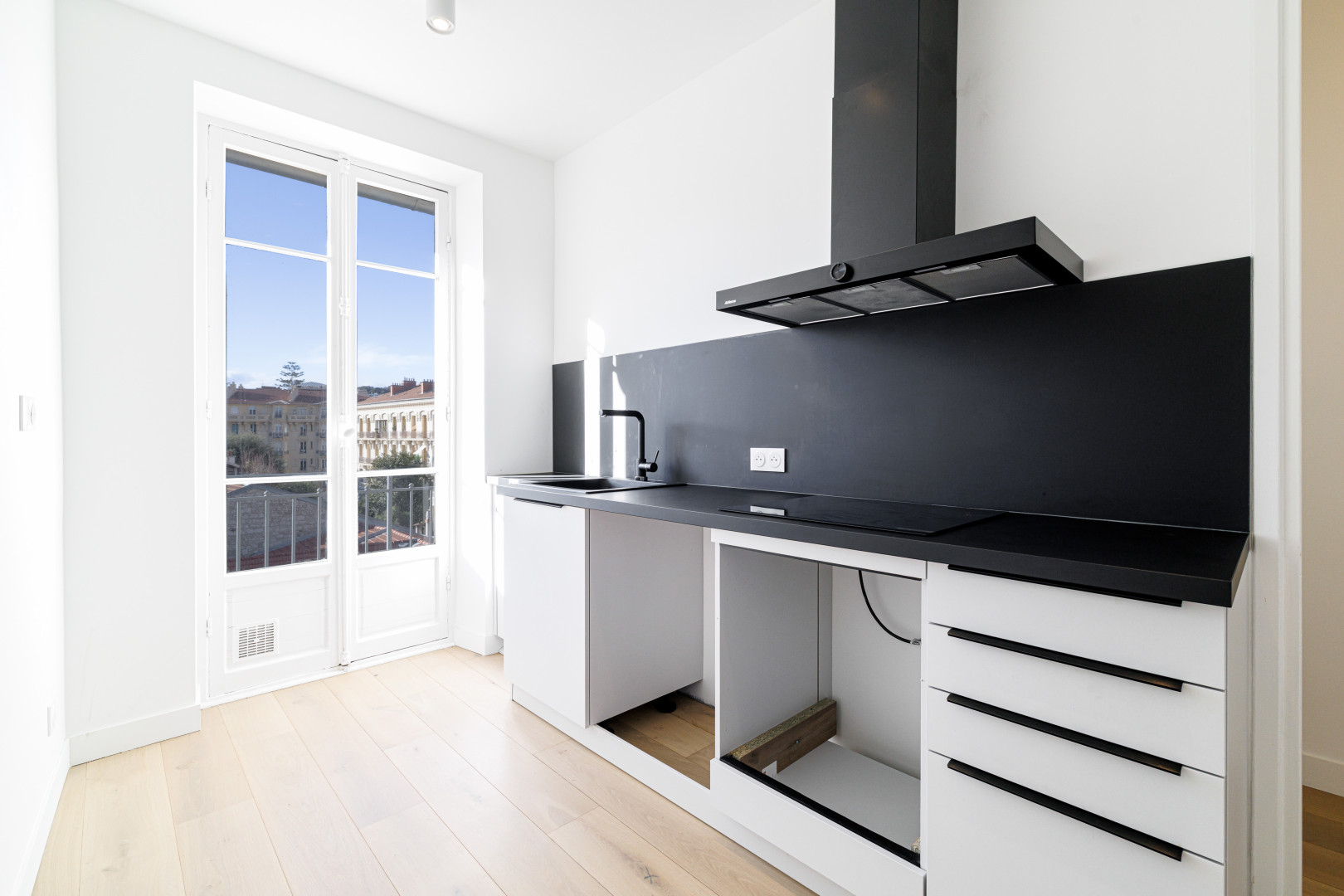 NICE / CARRÉ D'OR - En dernier étage d'un immeuble avec ascenseur, cet appartement traversant entièrement rénové comprend un hall d'entrée avec placard, un grand double séjour lumineux donnant sur une terrasse, une chambre spacieuse donnant également sur un balcon, une salle de douche, un W.C. séparé et une cuisine séparée (aménagée).