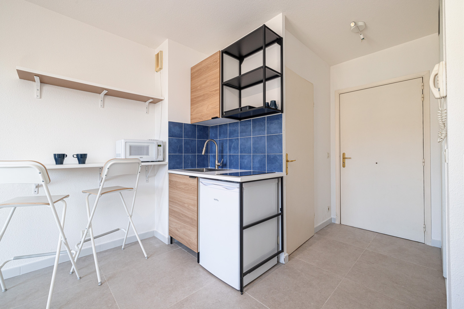 NICE / RIQUIER - Au 4ème étage d'un immeuble avec ascenseur, cet appartement de type studio comprend un hall d'entrée avec placard, une salle de douche avec W.C. et meuble vasque, un séjour avec coin-cuisine et un balcon.