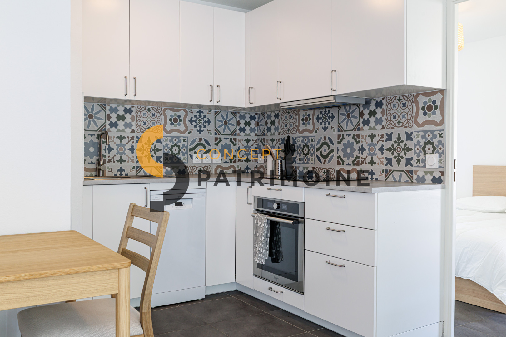 Composé d'un spacieux séjour avec cuisine équipée, d'une chambre avec placards, d'une salle de douches avec WC et d'une terrasse de 15,35 m².