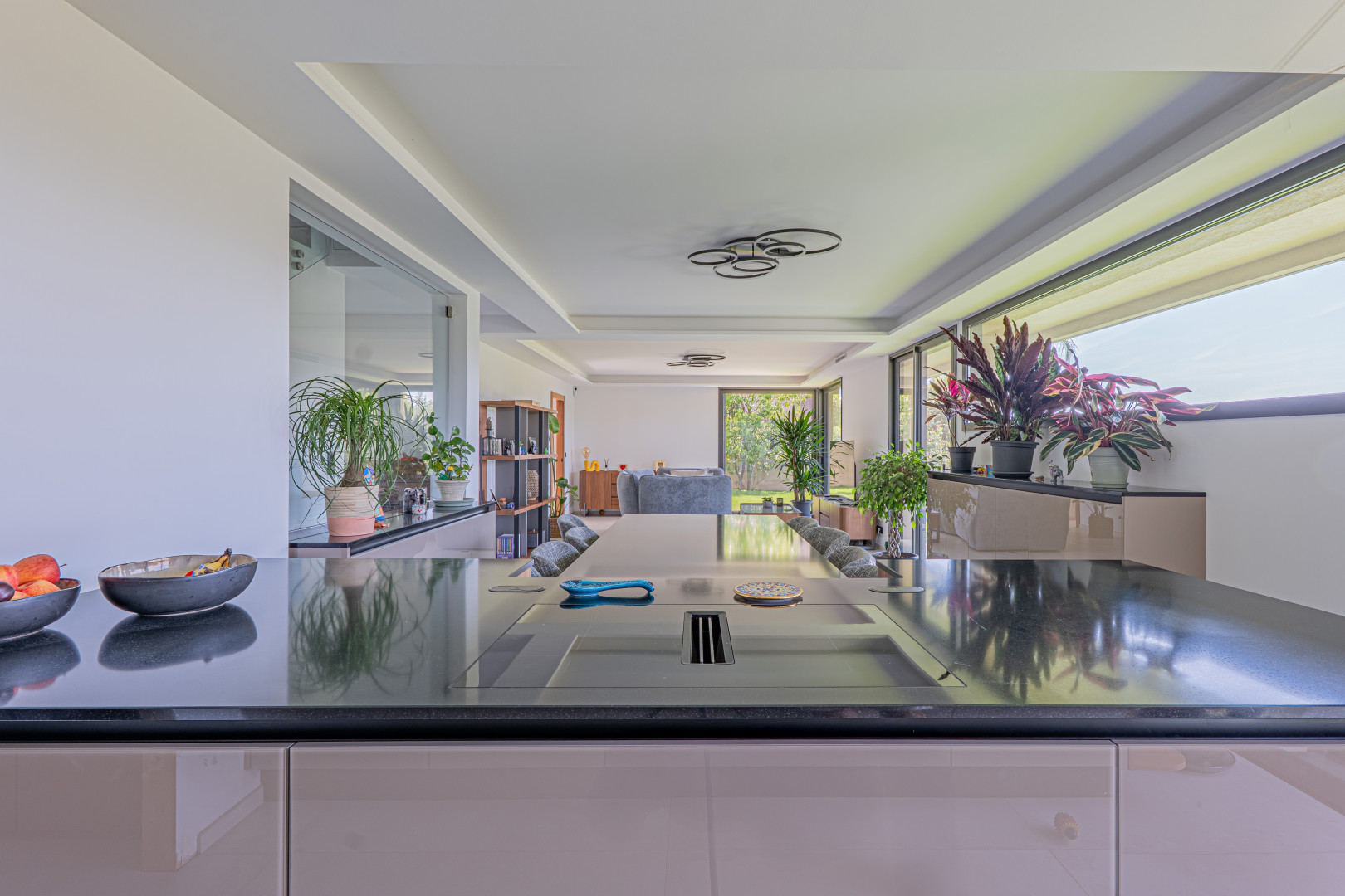 Les extérieurs ont été pensés comme un véritable havre de paix, avec un jardin arboré aux essences méditerranéennes et exotiques. La piscine à débordement, habillée de pierres balinaises et bordée de quartz, confère à l’ensemble une atmosphère unique.