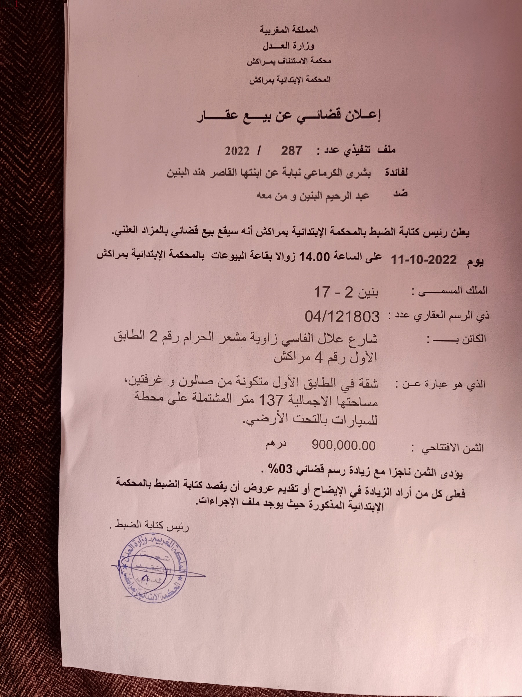 Il sera mit en vente le 11/10/2022 à 14h dans la salle n°6 du tribunal de sidi Youssef.