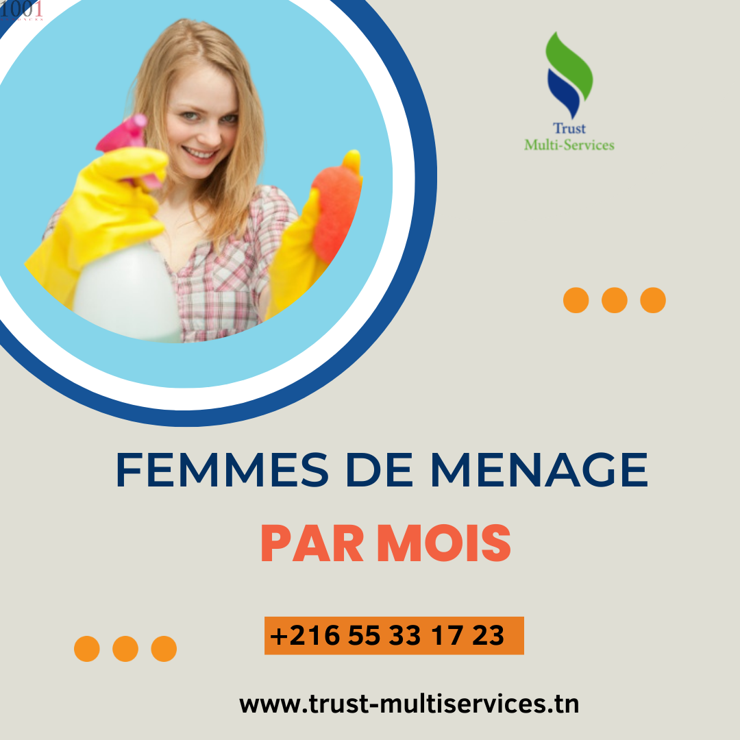Notre société propose des #femmes_de_ménage_par_Mois travaillant Couchantes ou Non Couchantes chez des familles Tunisiennes ou étrangères sur Toute la Tunisie.