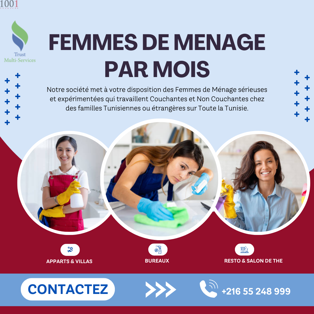 "Notre société met à votre disposition des Femmes de Ménage sérieuses et expérimentées qui travaillent Couchantes et Non Couchantes chez des familles Tunisiennes ou étrangères sur Toute la Tunisie.