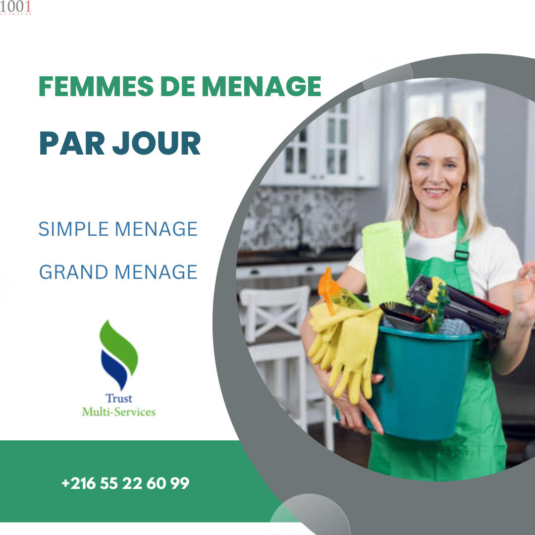 Prix : A partir de 50 dt, Il dépend du type de nettoyage à effectuer (simple ménage ou grand ménage) et de la surface du logement.